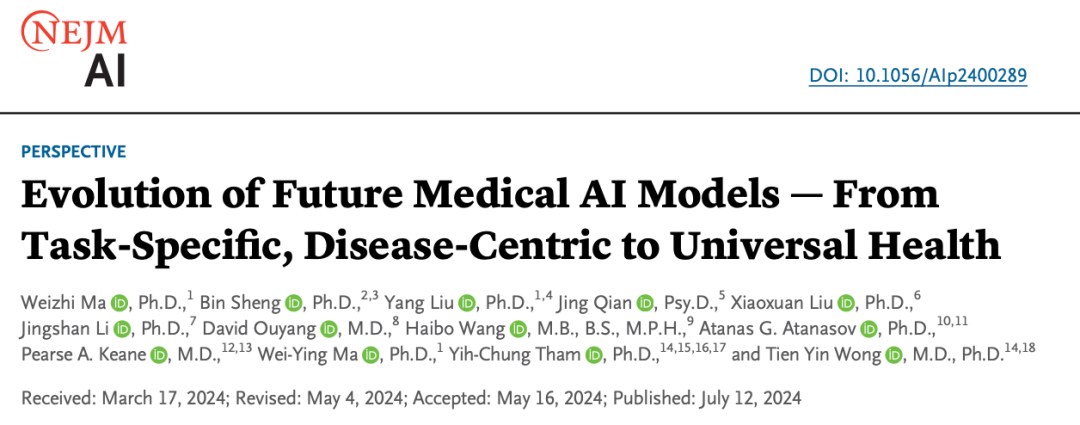 Recently, Professor Ma Wei-Ying, Chief Scientist at Tsinghua University’s Institute for AI Industry Research (AIR), along with Executive Dean Professor Liu Yang and Assistant Professor Ma Weizhi (first author), collaborated with several professors from Tsinghua University’s School of Medicine, Department of Industrial Engineering, and Department of Psychology and Cognitive Science, as well as renowned scholars from Shanghai Jiao Tong University, the University of Birmingham in the UK, UCLA Cedars-Sinai Medical Center, the First Affiliated Hospital of Sun Yat-sen University, Medical University of Vienna, University College London, and the National University of Singapore, to publish a viewpoint article titled "Evolution of Future Medical AI Models — From Task-Specific, Disease-Centric to Universal Health" in the high-impact medical AI journal *NEJM AI*.