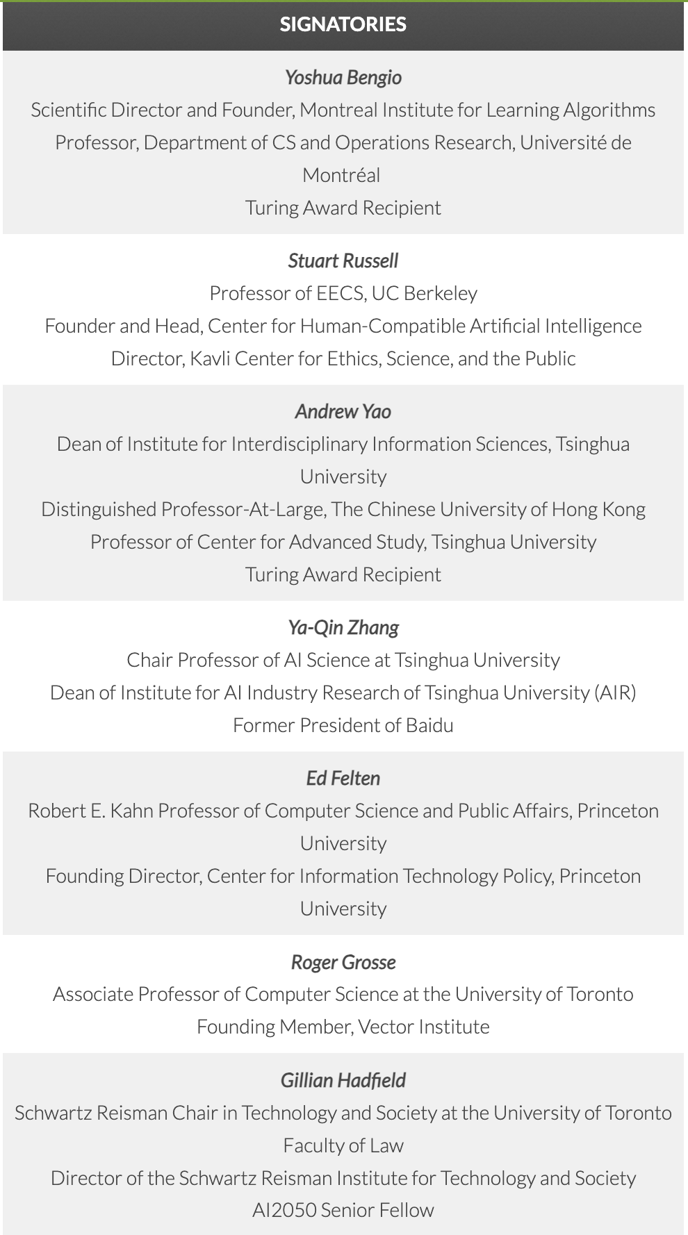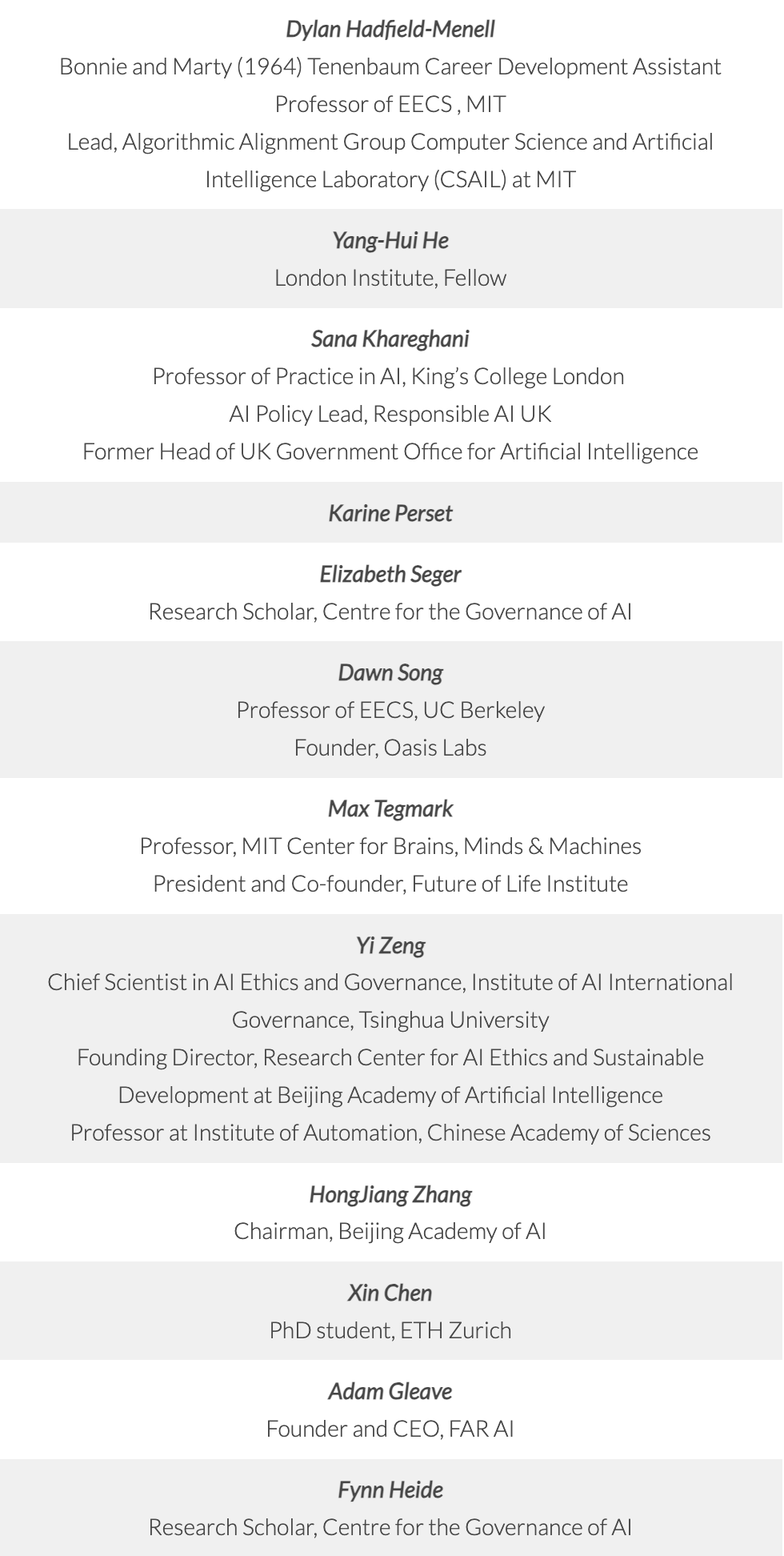 (AIR)院长张亚勤联合召集了来自中国、美国、英国、加拿大和其他欧洲国家的20多位顶尖AI科学家和治理专家,齐聚英国牛津郡迪奇利公园(Ditchley Park),进行了为期三天的首届“人工智能安全国际对话”(International Dialogue on AI Safety),部分与会者签署了一份联合声明:呼吁“在人工智能安全研究与治理上的全球协同行动,是避免不受控制的前沿人工智能发展为全人类带来不可容忍的风险的关键。”