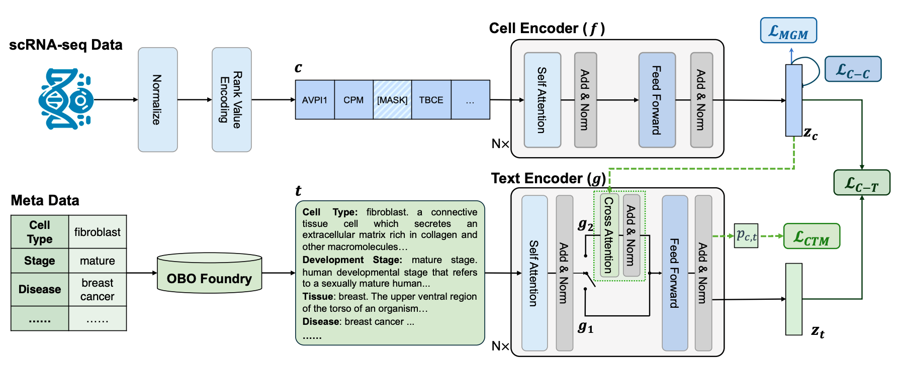 文本编码器又有单模态和多模态两种编码模式。单模态时相当于一个BERT模型,用于将文本转换为嵌入向量;多模态时在self-attention后添加cross-attention模块,融合细胞嵌入向量计算联合表征,并通过线性层预测细胞-文本匹配概率。