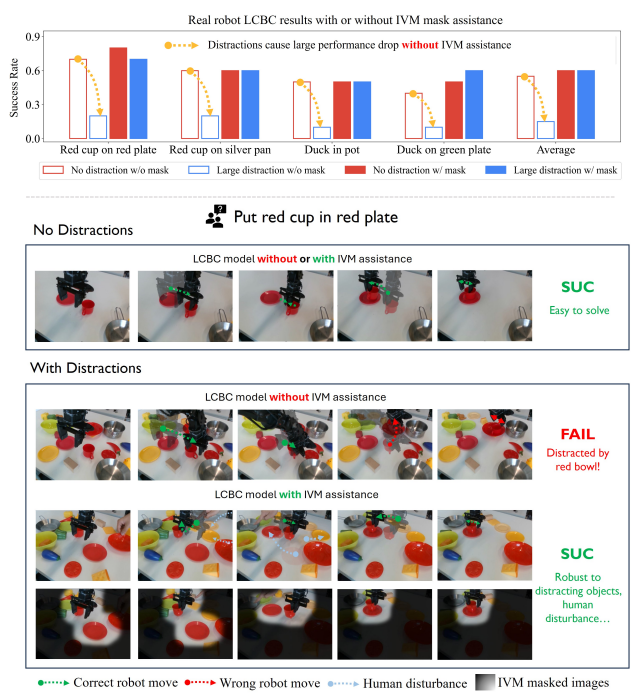 在决策任务上,本文的实验方法为,在控制过程中将IVM简化前后的图像分别输入到由相同数据训练得到的控制模型中进行测试,比较两者的性能差异。结果如下图所示,视觉输入经过IVM简化后,控制模型展现出了良好的抗视觉干扰能力,任务成功率远高于输入原图像的控制模型。