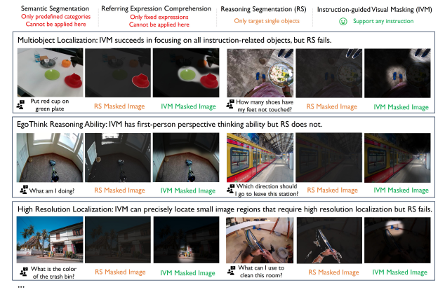 如上图所示,IVM与已经存在的视觉定位(VG)任务一定的相似度但是更加具有挑战性,已经存在的最先进的视觉定位模型在复杂的视觉理解任务下均失败了,这是因为过去的VG任务主要面向定位一些由特定语言描述的或是提前定义好的物品,而IVM需要面向复杂的语言指令进行推理并定位所有与指令相关的内容部分。