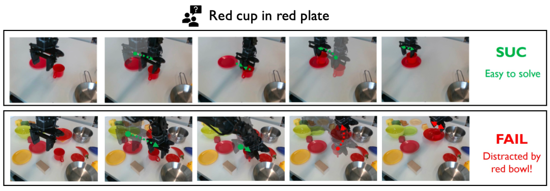 具身智能体在复杂场景的泛化能力始终是一个广受关注的研究方向,产业界及学界都希望训练出的智能体不仅仅能够在少数场景中表现良好,也能够在更多未知的复杂场景中具有泛化能力和鲁棒性。然而遗憾的是,这个目标对于目前AI具身智能决策控制模型还是十分困难。课题组发现增加场景的复杂度即视觉干扰(Visual distraction),会导致在简单场景表现良好的决策控制模型性能严重下降。