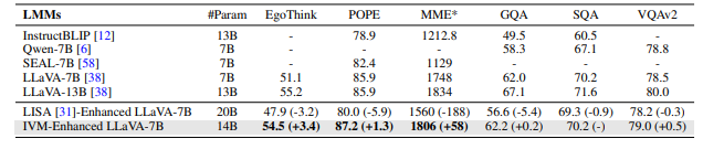 其次,将IVM模型与现有最流行的开源大模型LLaVA相结合,并在六个经典的多模态问答测试集上进行测试,结果表明IVM能够稳定地提升正确率,展现了IVM的通用性。
