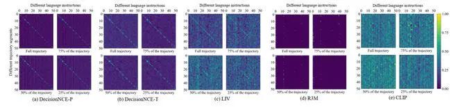 课题组首先测评DecisionNCE-P/T捕捉全局/局部时序信息的能力。理想情况下,DecisionNCE-P/T需要为匹配的视频-语言对分配更高的奖励值,为不匹配的视频-语言对分配较低的奖励值。下图可以清晰地看出来,DecisionNCE-P/T的斜对角线(匹配的视频-语言对)呈现出明显的亮线,说明其不论针对短的视频片段还是长的视频片段都可以识别出正确的时序信息。相比之下,其他baseline算法例如R3M, LIV和CLIP则不具备这样的能力,特别是针对短视频片段受到噪声的干扰严重。