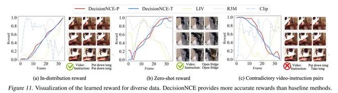 由于BT 模型本身就是一种奖励函数建模方法,因此DecisionNCE-P/T不仅可以用作表征学习,还可以提供通用的奖励函数。课题组可视化了DecisionNCE-P/T对不同的视频-语言对预测的奖励函数,如下图所示。