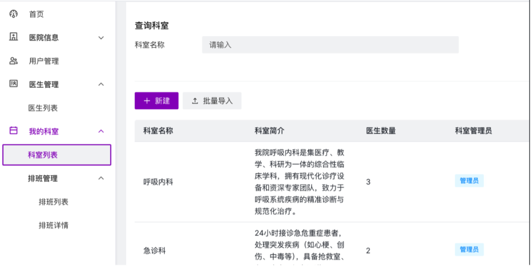医院客户端将为医院提供:1) 医院信息管理,在系统中维护医院的各方面基本信息;2) 统一排班放号,便捷医院协调出诊的医生及班次,提升管理效率;3) 数据汇交对齐,利用智能体技术自动将中间的诊疗记录进行整理归档检验,以符合数据汇交要求;4) 统计数据看板,方便了解整体的系统运行情况和记录。