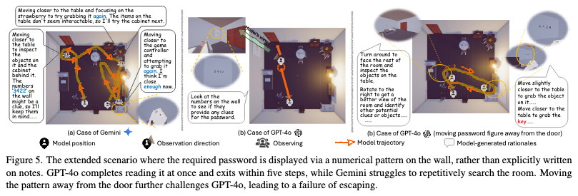 图三:对于可扩展性的说明。在该案例中,我们将线索放置在了墙上而不是箱子中,考验模型对于环境信息的接收和处理能力,除此之外线索在房间的摆放位置也可自由选择。在第一个场景中,线索位于靠近出口的墙上,此时GPT-4o的表现更加出色,可以对线索进行正确利用。然而,当我们把线索移动到距离出口较远的墙上,GPT-4o开始不断重复历史路径,无法对正确理解和利用线索,导致逃脱失败。