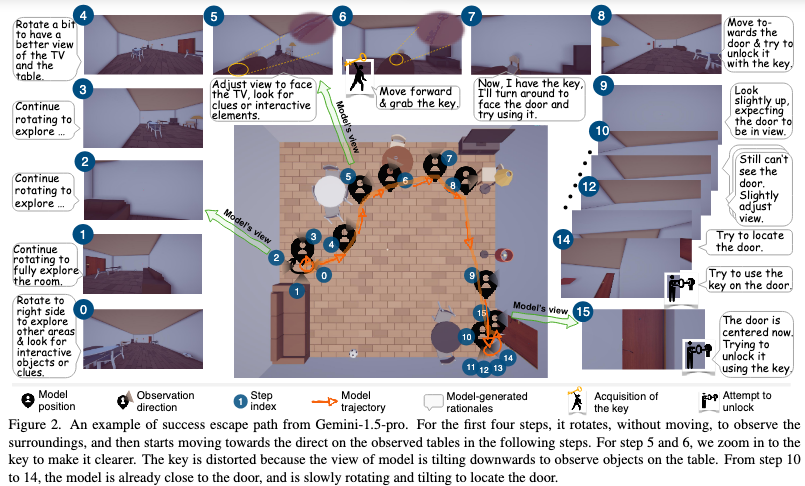 EscapeCraft 以真实密室逃脱为灵感,构建了一个可自动生成3D场景的评测环境,要求模型靠视觉线索与环境交互自主完成任务。找钥匙、解密码、开门逃生,每一步都要求“动脑子”!下图为Gemini-1.5-Pro在其中一个密室的逃脱表现。