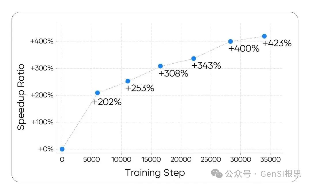 实践发现,直接最小化步数会导致训练过程不稳定。为了解决这个问题,团队采用了一种更稳定的代理损失函数 (surrogate loss)。该损失函数基于生成轨迹中不同步骤之间的编辑距离,鼓励模型以更高效的方式收敛。如下图所示,该训练过程成功提升了模型的推理速度。