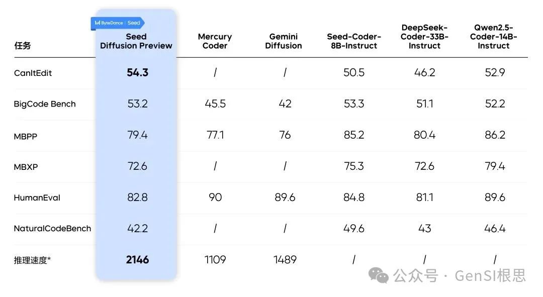 在生成任务测试中,Seed Diffusion Preview 充分释放了扩散模型的并行潜力,较同等规模的自回归模型实现了 5.4 倍的速度提升。