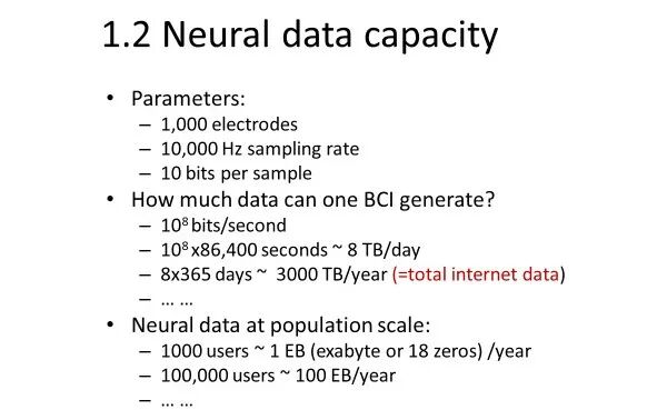 针对人类的神经数据容量,曾教授进行过估算:一个人 + 一套高通量 BCI,一年产出的神经数据量,已经与整个互联网的高质量数据同一量级。具体来说:当前一代高通量 BCI约 1024 个电极;采样率约 10 kHz;动态范围约 10 bits。粗略估算:每秒记录的数据量:约 (10^8) bits;一天可产生约 8 TB 数据;一年就是约 3000 TB(3 PB)数据。这还只是来自一个人的一套 BCI 设备。如果未来有成千上万名病人或志愿者长期植入 BCI,并持续记录数据,那么神经数据的总量将轻松达到 Exabyte(EB)级,远超现有任何公开数据源,相比之下,人类可用的高质量互联网数据也不过几百 TB 级别。