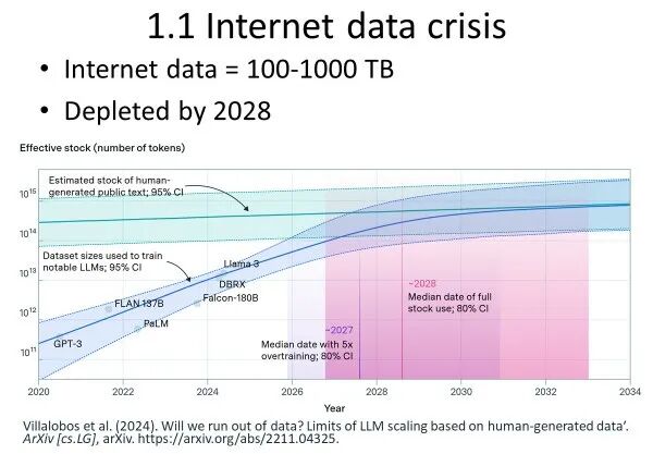 当前 AI 发展如日中天,但有一个常被忽视、却极为关键的问题:高质量训练数据正在变成稀缺资源。研究团队测算,目前人类在公开互联网中可用于训练大模型的高质量、有标注的文本、图像、语音等数据总量,大约只有 200–1000 TB 量级。在 GPT-3 时代,十几个 TB 的高质量数据就足以训练一个“不错”的模型;而如今的大模型随便就是 50–100 TB 的训练规模。以当前的发展趋势推算,乐观估计到 2028 年左右,互联网可用的高质量数据将基本被“吃干榨尽”——而数据一旦用于训练,就很难“当成新数据再用一次”。换句话说,算力可以不断扩展,模型可以不断加大,但高质量人类行为数据这个“燃料”却接近见底。这使得经典意义上依赖“Internet Data + Scaling Law”的 AI 路线,正面临一个不可回避的天花板。