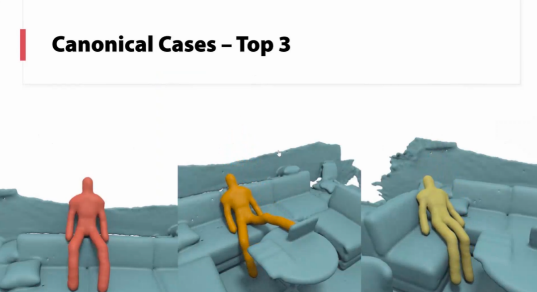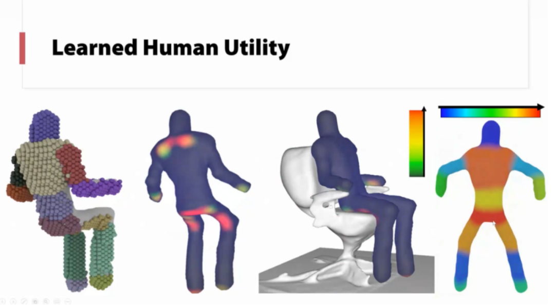 接下来,朱博士为我们介绍了Utility。其中一个典型的案例就是对椅子的识别,椅子的定义十分的广泛,仅通过标注的方式很难进行准确且全面的识别。朱博士团队首先进行了场景重建,并观察了人与场景的交互,跟据人坐下的行为得出了力的热力图,从而提取出可以作为椅子的物体,以及椅子的舒适性,本研究仅基于物理模型,没有进行任何训练。