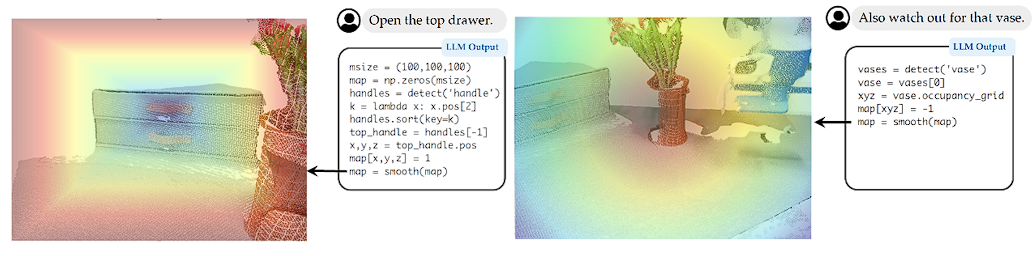 李昀烛博士首先介绍了机器人操作中任务的定义。对于机器人操作而言,一个对人来说很基本的任务描述(如“清理桌面”、“叠衣服”)都需要机器人对环境中大量的信息的理解,而基础模型学到了很多对环境常识信息的理解,因此可以用于引导机器人执行各种操作任务。李昀烛博士以VoxPoser为例,每个任务被描述为自然序言,机器人需要理解自然语言指令,并找到对应的物体执行对应的操作。在语言指令的使用层面,相比于端到端训练的方法,李昀烛博士提出了使用代码作为中间层描述,作为嫁接自然语言指令输入、基础模型、机器人底层操作的桥梁。通过利用基础模型生成代码,以客观函数的形式,这些函数描述了当前任务对机器人的动作的需求,并规划机器人做底层操作,以一步步完成任务。例如VoxPoser中LLM和VLM生成的Affordance Map和Constraint Map,用于引导机械臂操作轨迹规划。