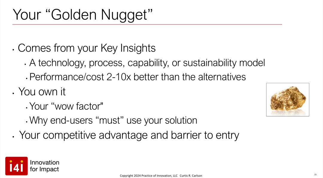 Carlson introduces the concept of the "Golden Nugget," a key insight that provides a significant performance or cost advantage, creating a "wow factor" that compels end-users to adopt the solution.