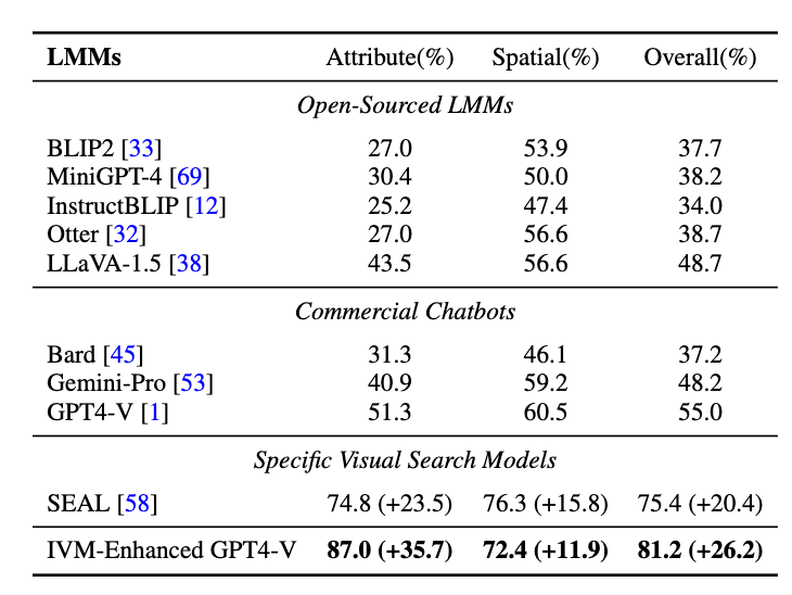 在多模态问答任务上,本文的验证实验分成两部分:首先,尝试将IVM模型与现有最先进的闭源多模态大模型GPT4V相结合,在最新的多模态问答测试集V*bench上进行测试。IVM将GPT4V在该测试集上的正确率提高了35%,首次突破80%,展现了强大的视觉定位能力。