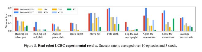 通过将大量领域外数据训练得到的通用表征,接入一个超轻量级的下游决策模型(两层MLP),并基于极少量的机械臂视角数据进行语言条件的行为克隆(Language-conditioned behavior cloning,LCBC)学习,课题组成功构建了具有语言指令理解能力的多任务机械臂决策模型。课题组在实物实验中测试了抓放(pick & place),挪动 (move),开 (open),关 (close),叠 (flod),摆正 (flip)五个机械臂操作的基础技能,涵盖9个子任务。结果表明,所提出的新方法在任务执行成功率方面大幅由于现有主流方法。结果如下表所示。