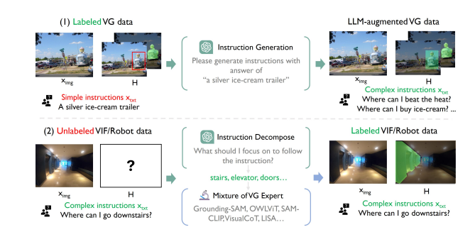 从上述分析可以看出训练一个这样的VG模型是具有挑战性的,其中最大的问题是缺少具有多样性且符合要求的丰富数据。为了解决数据缺失的问题,课题组针对已有的两类可用开源数据分别设计了一套由大语言模型驱动的多专家合作数据生成方案(LLM-empowered Mixture of Expert Annotation Pipeline):1. 针对视觉定位标签但缺少丰富指令的数据,通过调用大语言模型来根据标签的内容生成对应的复杂指令 2. 针对具有指令单缺少定位标签的数据,由于现有的任一单一模型都不足以生成足够好的标签,因此课题组首先调用大语言模型对指令进行推理简化,再将简化后的指令和图片输入到多个视觉定位专家模型中,整合所有专家的输出来得到高质量标注。