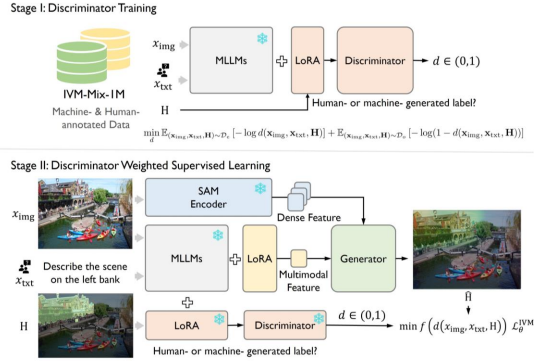 以下介绍IVM的模型架构设计。相关的设计受到了最近“推理分割”任务的启发,课题组引入了SAM和一个多模态大模型LMM来分别提取稠密视觉信息和多模态信息。最后将两者输入到一个生成器中来实现遮罩预测。