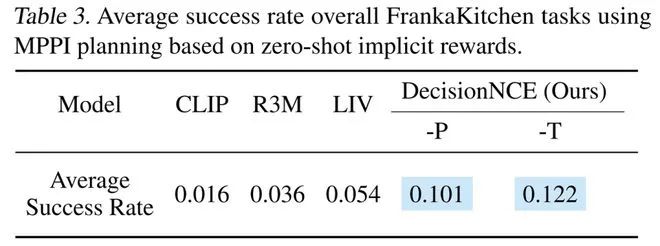 结果表明DecisionNCE-P/T不仅可以对分布内的数据(in-distribution)预测正确的奖励变化趋势,还具有很好的分布外泛化能力(zero-shot reward)。同时值得一提的是,因为DecisionNCE自身对比学习的特性,它可以很为完全相反的视频-语言对分配相反的奖励变化趋势。因此,DecisionNCE所附带提供的通用奖励函数也可以直接与决策领域的规划算法(例如MPPI)相结合,实现zero-shot language-reward planning。课题组在FrankaKitchen仿真环境对此进行了测试,DecisionNCE-P/T学习得到的通用奖励函数在规划任务上同样大幅领先同类方法。